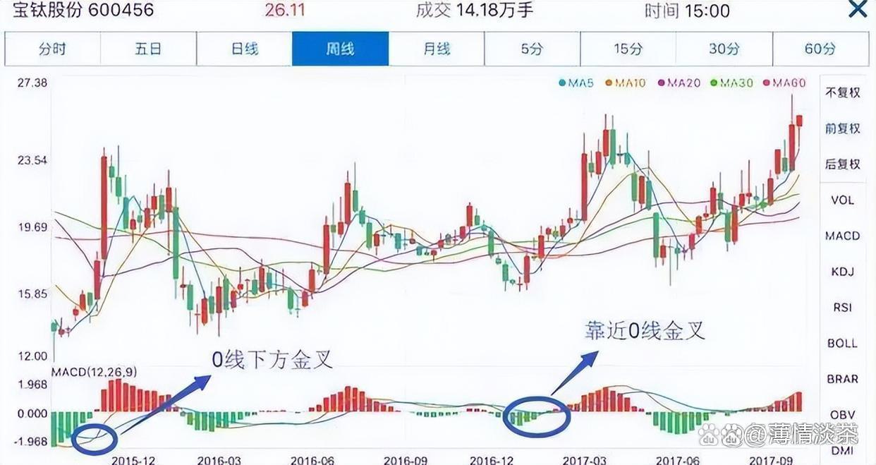 3、0轴下方金叉买入法。有时确实是一波上涨行情,有时却只是一次短短的反弹,通常要结合成交量及其它技术指标综合分析;