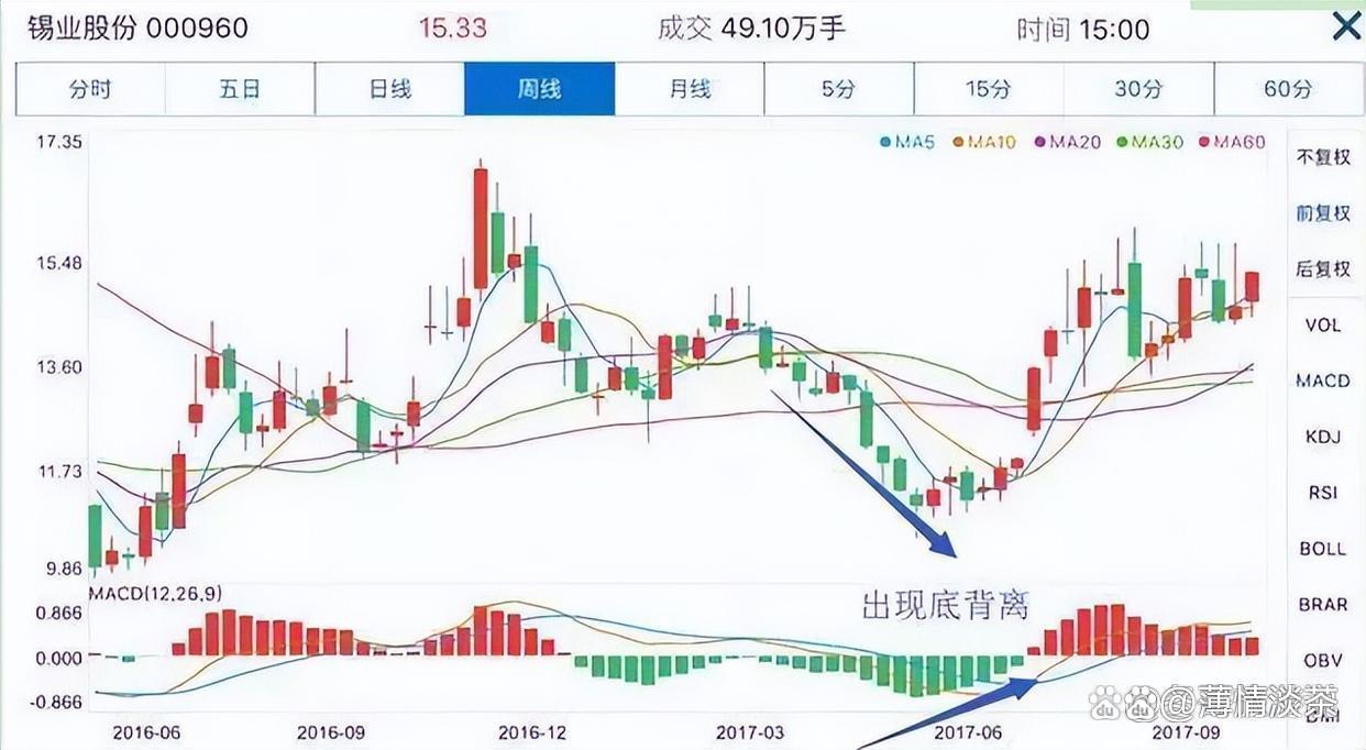 4、顶背离:价格上升,技术指标下降;底背离:价格下降,技术指标上升(锡业股份:底背离的同时,成交量逐渐萎缩,是看涨信号,当底背离完成,成交量放大,看涨信号更明显)