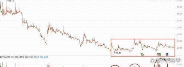 价格经过了漫长的下跌,下跌过程中,曾有多次放量反弹,然后回到下跌趋向,价格创新低。