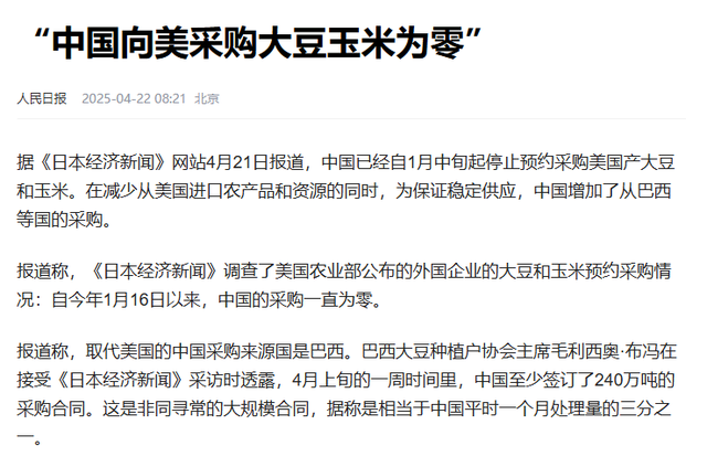 《日本经济新闻》在4月21日,披露了一则重大消息:中国在1月中旬时,已经停止预约采购美国大豆和玉米了。