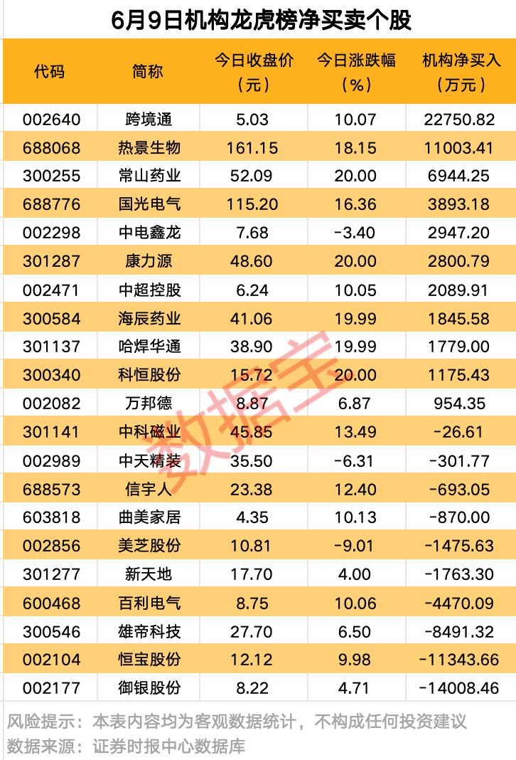 6月9日,龙虎榜中机构席位资金净买入1.47亿元,其中,净买入的个股11只,净卖出的个股10只。